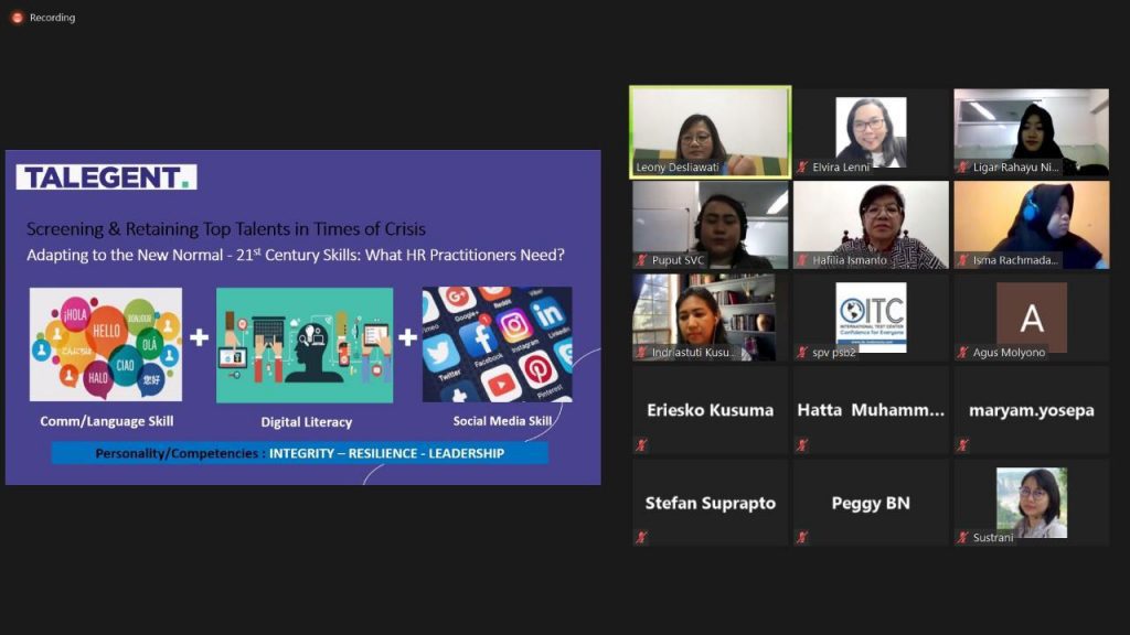 Pada tanggal 9 September 2020, PT ITC menyelenggarakan Webinar Talegent dengan tema “Screening and Retaining Top Talents in Times of Crisis”. Hal ini sangat sangat berhubungan dengan kondisi yang saat ini sedang kita alami bersama yakni dalam masa pandemi karena Covid-19. Peserta yang hadir merupakan HR dari perushaan dimana mereka memerlukan informasi baik untuk proses asesmen ataupun rekrutmen.